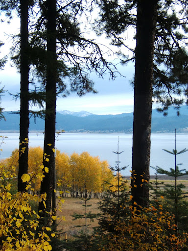We went for a drive to see all the Fall colors. We were on a very nice dirt road on the edge of the lake and at the base of a mountain. The forest is mostly coniferous, but there were pockets of bright yellow and even some orange aspens, making a great contrast with the dark green of the firs and pines.