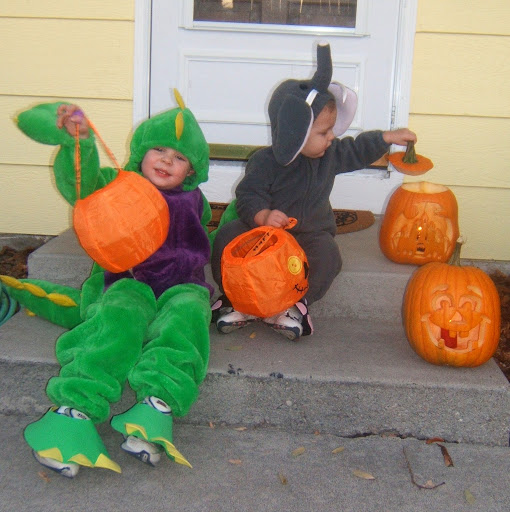 All day, Jared kept telling people "Happy Halloween Day!" He said that Halloween didn't really start until the sun went down. We had all sorts of boring errands to run, but it was made more fun by wearing orange and black and looking for people in costumes. Then we came home and made shoe covers from craft foam to finish off the boys' costumes. And Zach refused to take his nap. Any other day would have been better than Halloween to skip a nap!
