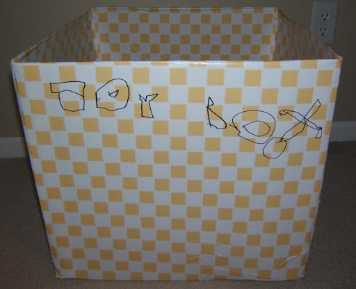 We used some old Contact paper to cover a big cardboard box to corral part of our plethora of toys. Jared had fun watching and playing with the huge rolls of backing paper when I peeled them off. Then I used a permanent marker to draw the word "TOYS" on the front. Jared got a turn with the marker (scary!) to write his choice, "TOY BOX" on the other side.