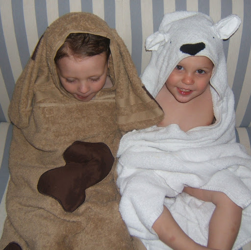 SUSIE'S ZOO COME ALIVEToday I finally got around to finishing up the last few details of a polar bear hooded towel that I made for Jared, oh, about 3 years ago. He outgrew it and got a new puppy one for his 4th birthday, and Zach's inheritance of the polar bear was the impetus I needed to put on eyes and a nose. I don't think he noticed, but the two of them running around in their semi-costumes was an endearing sight. Here are some more photos.