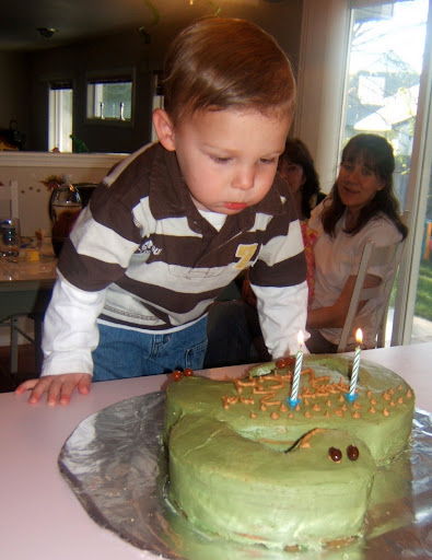 Zach must have been paying attention to all the birthday parties he's been to, because he's a pro! He stood in front of his cake while we sang to him, and the moment the singing ended, he tried to blow out his candles. It took him a few tries, but he did it.