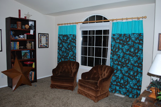 This is really fun. The photo makes the turquoise look much brighter than it really is. They're much more sophisticated than they appear in the photo! I promise! I'll pull in the turquoise elsewhere in the room, and maybe we'll even get a couch some day...