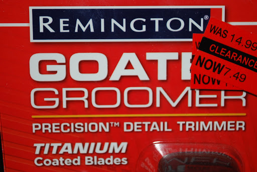 So I gravitated (it's a magnetism I was born with) toward the Clearance rack at ShopKo and found a goatee groomer on sale. I bought it for Ryan, hoping it would make it easier for him to keep the facial hair. When I got it home, he said, "what are you trying to say?" I hadn't noticed the placement of the price tags. It says, "GOAT GROOMER!"