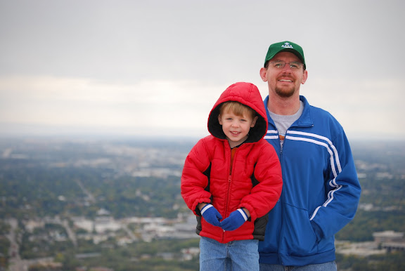 When we saw that the mountains and foothills were covered with snow, we just had to go see it! So we drove to Table Rock, which is a big flat outcropping in the foothills of the Boise Mountains. The snow had almost melted that high up the hills when we got there, but Jared had a lot of fun making snowballs, dumping snow into the puddles and pools in the rocks, and making a "snow cake." He nearly cried when our wind-chapped, frozen faces insisted that we go back home!